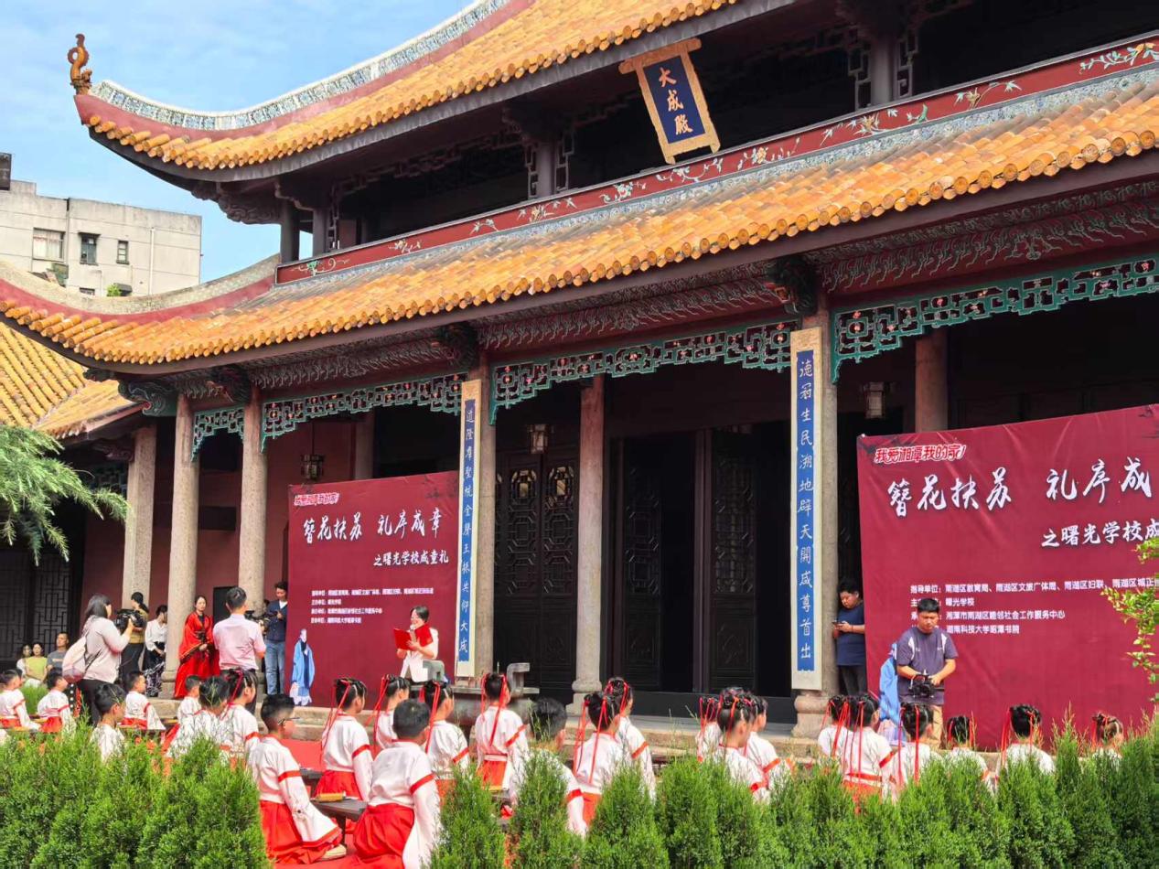 6月5日上午,在昭潭书院文庙孔子像前,曙光学校即将步入五年级的学子们在此举行了一场“仪式感满满”的成童礼活动。活动中,学生们身着传统汉服,在古朴雅乐中行沃盥之礼、点朱砂、击鼓明志,将尊师重教、感恩父母、知礼明责、心怀家国的种子深植心田。本次活动由雨湖区教育局、文旅广体局、妇联及城正街街道指导,雨湖区睦邻社会工作服务中心承办,湖南科技大学昭潭书院协办。